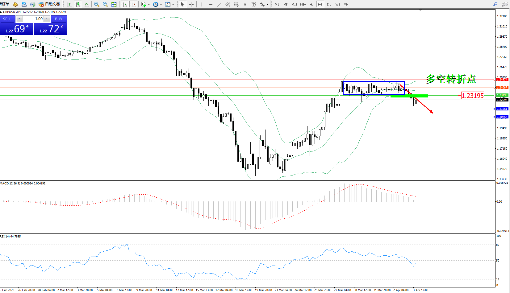 交易策略:1.23195下方看跌,目标1.21661、1.20754