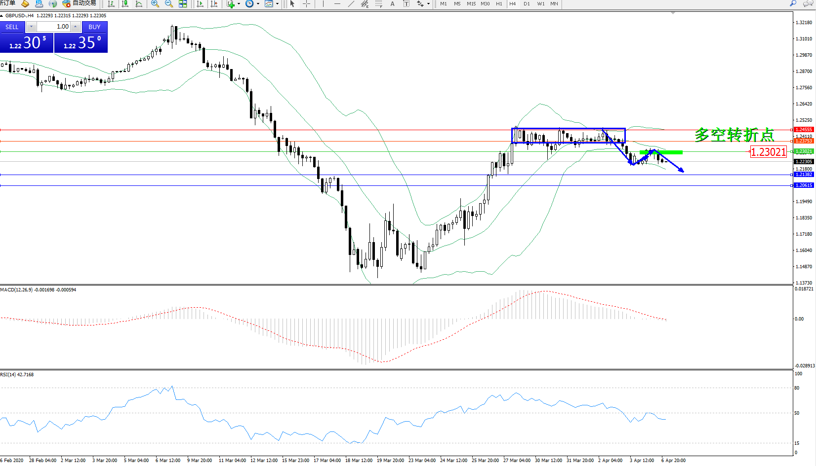 交易策略:1.23021下方看跌,目标1.21382、1.20615