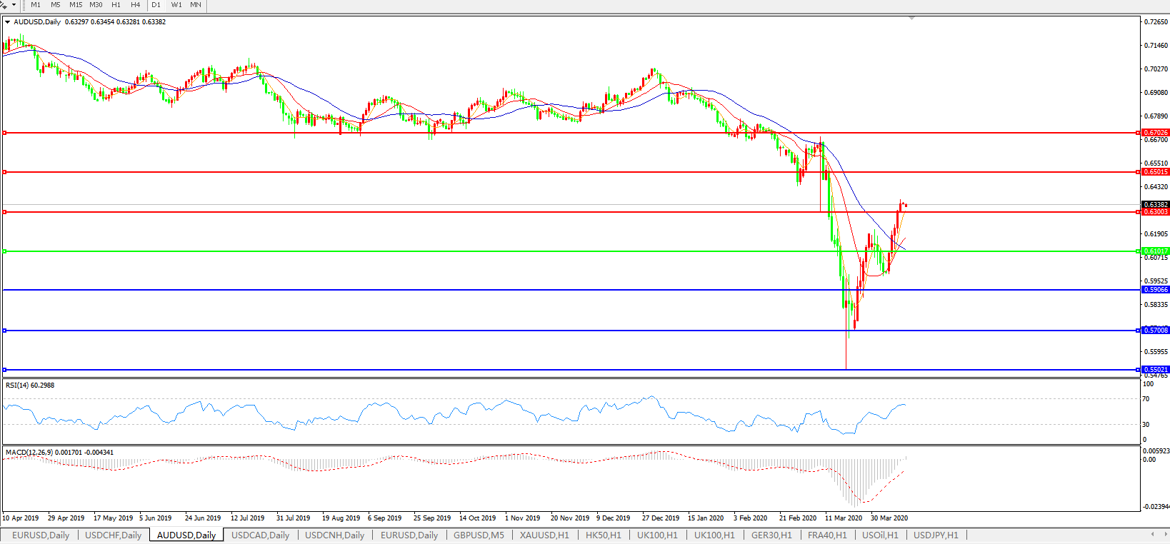随着澳洲冠状病毒新增病例持续减少,澳元兑美元持续上涨,日内创下3月12日以来新高至0.6368;澳洲上日新增病例100人,进一步远离3月22日出现的高峰日增537例,实现这一目标要归功于澳洲通过制定严格且具有强制力的物理隔离措施;本周,澳洲议会还投票通过了史上最大规模的刺激方案。逾800亿美元的一揽子刺激计划将帮助企业融资,陷入困境的企业员工每两周还能从政府那里得到1500美元的支票;澳洲联储还宣布,计划将三年期债券收益率保持在2.5%下方。在过去三周中,澳洲联储总共购买了逾415亿澳元的政府债券。最近的数字显示,澳洲联储已经开始缩减购债规模;中国实现有序复工也利好澳洲经济,因澳洲约三分之二的商品出口到中国,包括煤炭、铁矿石、天然气等。更重要的是,澳洲的外国留学生有20%来自中国。