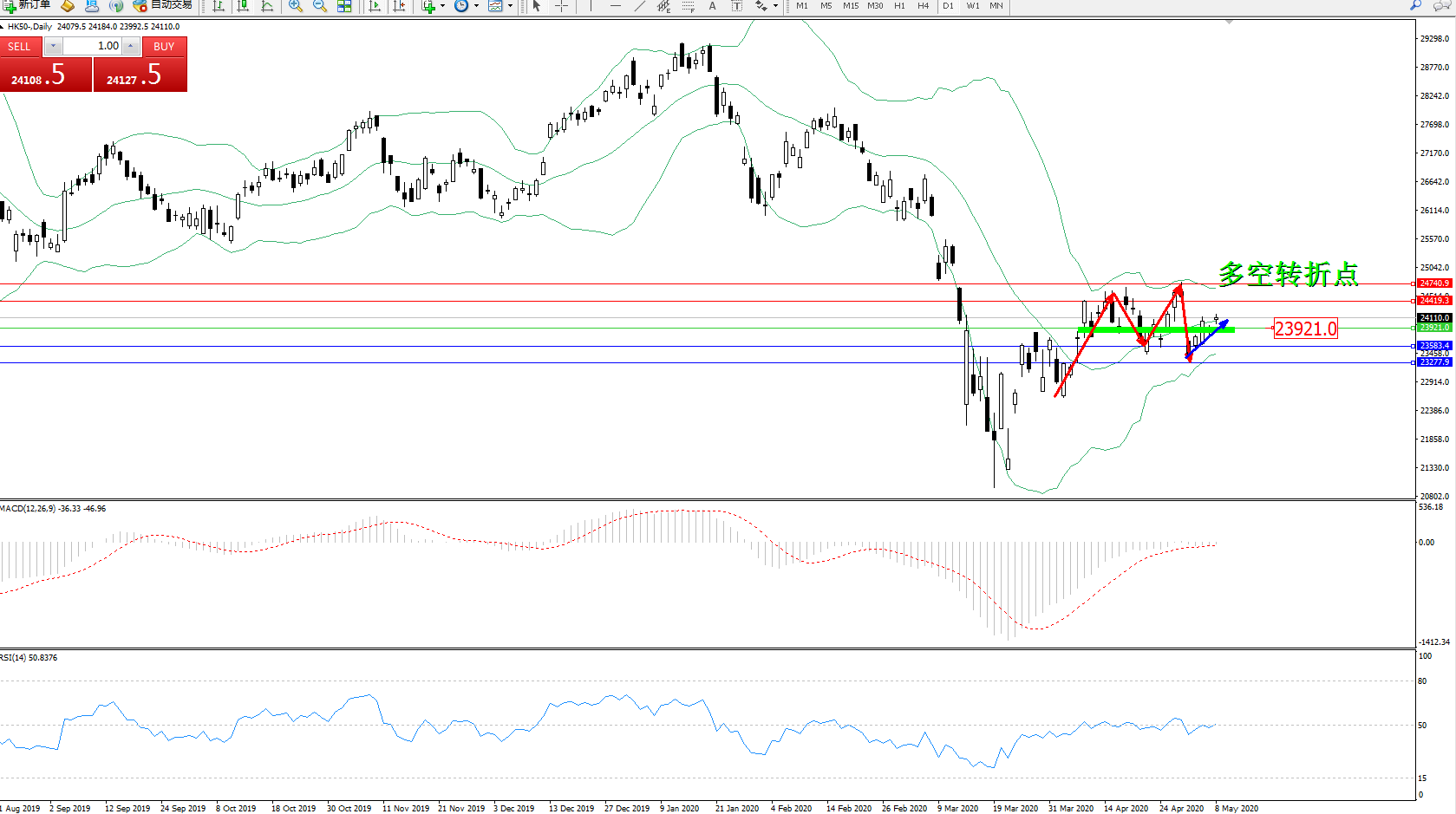 香港恒生指数5月8日(周五)收盘上涨249.54点,涨幅1.04%,报24230.17点;港股三大指数涨幅均超1%,;教育股与电池股走低明显,比亚迪电子跌3.36%。恒指国指成份股大多上涨,瑞声升4%,腾讯大涨2.7%,港交所延续昨日下跌行情,收跌1.46%;小米集团涨逾8%。小米公司(01810)举办超百家门店同期开业活动。小米之家客流约360万,虽比去年同期略有下滑,但销售额同比去年五一增长了13%,日均销售环比四月日均销售额全面翻番。自公共卫生事件后,小米零售在首个小长假迎来了线下经济的整体复苏。沪港通南向资金剩余426.06亿元,流出6.06亿元。深港通南向资金剩余395.75亿元,流入24.25亿元。受益于海外流动性危机缓解和部分欧洲国家疫情数据出现拐点,港股步入盘整筑底期,市场趋势性上涨还需要等待基本面数据回升。港股反弹至今已经有一个多月,未来继续上涨需要盈利支撑,然而基本面数据回升还需等待,加之美欧股市可能二次探底。