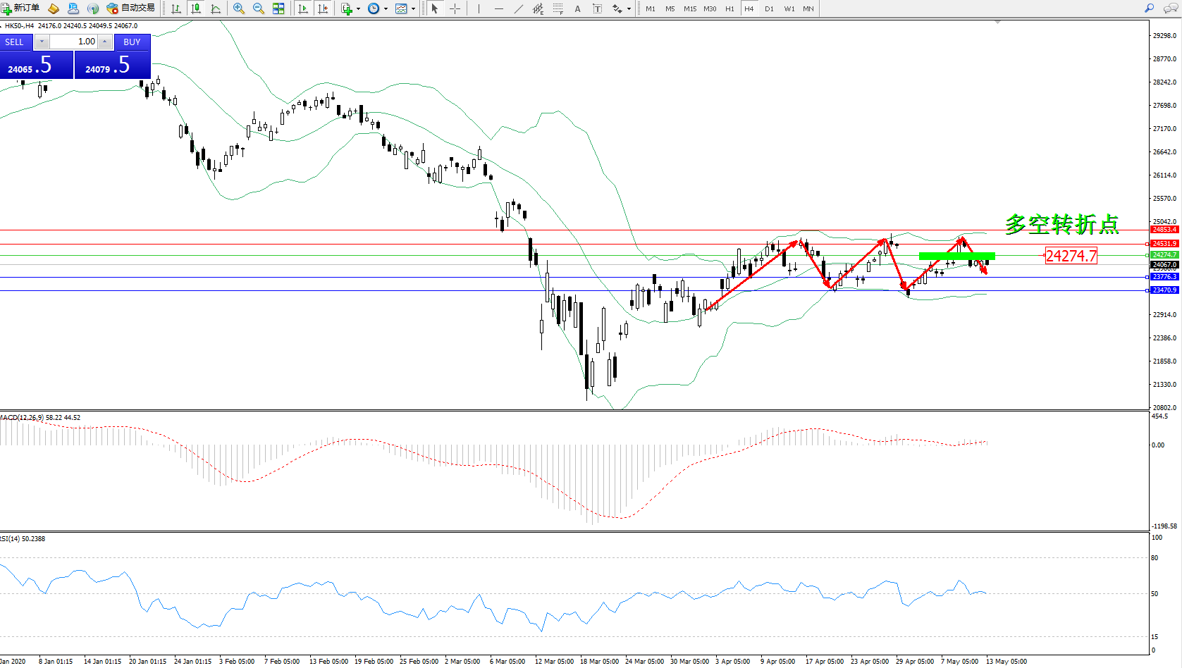 香港恒生指数5月13日(周三)收盘下跌65.38点,跌幅0.27%,报24180.30点;港股三大指数收盘涨跌不一,医疗设备股强势,威高股份、微创医疗盘中皆创新高;节假日概念股全线上涨,美团大涨5.45%总市值逼近7000亿港元;香港恒生指数上周先跌后涨,节后首个交易日急挫逾千点,其后几日震荡回升,但全周仍累计下跌逾1%。北水资金继续南下,但大市交投并未快速放大,热点股表现较为活跃。从技术上看,恒指24000点附近已拉锯一个月有余,下方支撑明显,留意短线向上突破节前高点的机会。对于全球疫情的忧虑逐步降温,市场焦点回到经济复苏上来,国际贸易关系若能维持平稳格局,也将利好风险偏好回升。港股上周初急挫千点,其后板块个股普遍反弹,但涨幅有所分化。汽车、医药、餐饮、芯片及手机股涨幅靠前,部分热门股表现强势,提升了市场人气。