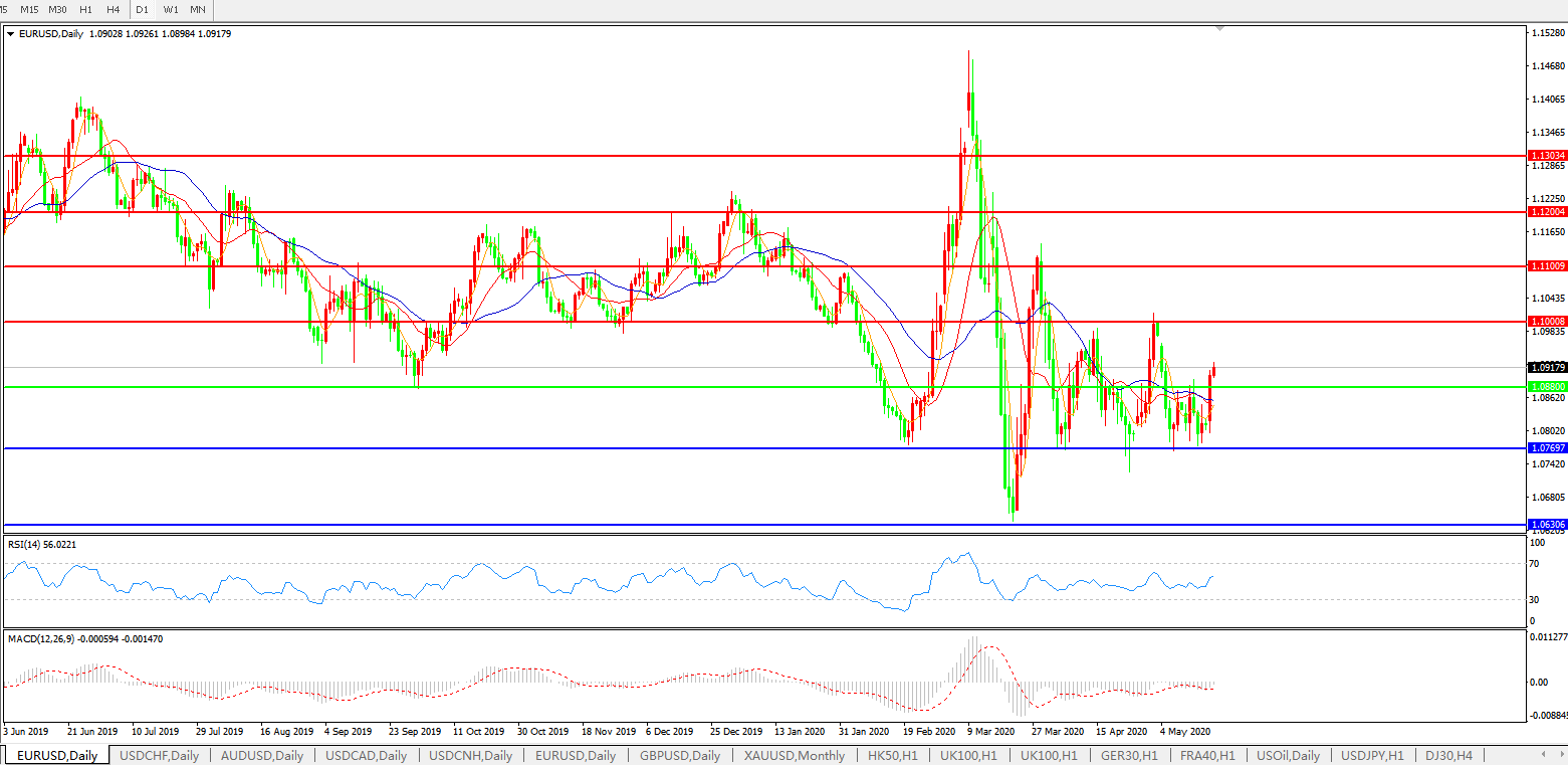 欧元兑美元和瑞郎周一跳涨0.86%创两周新高至1.0927,为近两个月最大单日涨幅,因此前德国和法国呼吁为欧洲设立5,000亿欧元(5,456.5亿美元)的复苏基金,并提议允许欧盟执委会从市场上借款来为该基金融资。目前汇价报1.0921;法国总统埃马克龙称法德协议是向前迈出的重要一步,旨在打破欧元区共同债务的僵局,并为更广泛的欧盟协议提供蓝图。Monex Europe外汇分析师Simon Harvey表示:“梅克尔和马克龙的言论表明,欧盟在联合发债方面取得了进展,相关措施旨在通过拨款,而不是贷款来保护陷入困境的产业,贷款只会推迟破产,尽管这些措施目前只是提议,但它为欧元兑脆弱的美元今日大涨开了绿灯。”丹麦银行(Danske Bank)欧洲央行和固定收益部门首席策略师Piet Haines Christiansen表示,这是一个强烈的政治信号,与人们担心的相比,我们对协议的细节确实感到惊讶,但这并不是板上钉钉的事。