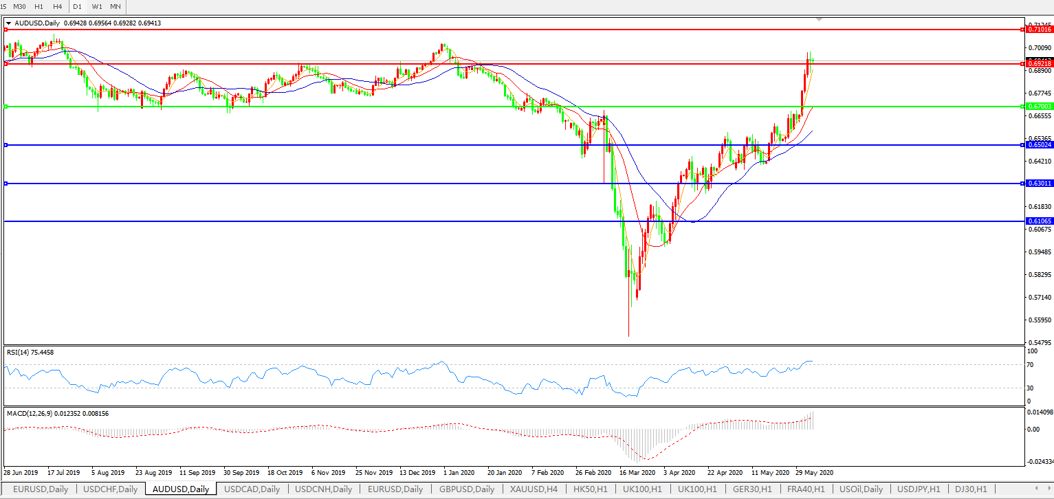 花旗银行周四(6月4日)表示对澳元仍采取结构性看涨倾向,但预期其近期内或将有所修正。澳元在大幅波动中赢得了大量的关注,周三澳元兑美元一度逼近0.7000,但随后回落。我们在悉尼的交易员警告应保持流动性和耐心,“昨日的价格动态指向看来详尽,感觉最后的回撤是做空风险和低配澳元仓位的产物。而此前的上涨在市场对美元的抛售中让人印象深刻。最近美国的骚乱凸显了第二波疫情的风险,这可能导致进一步的封锁,并令经济复苏进程受阻。经济数据方面,澳洲4月份零售销售稍好于预期,月率录得-17.7%,高于预期的-17.9%,前值为8.4%。明显的收缩并不出人意料,因为当时正值疫情高峰。我们预期将看到澳元的部分回撤,但仍保持总体看涨,认为其将在5月份零售销售数据公布后上涨,因经济可能显示较预期复苏更快。