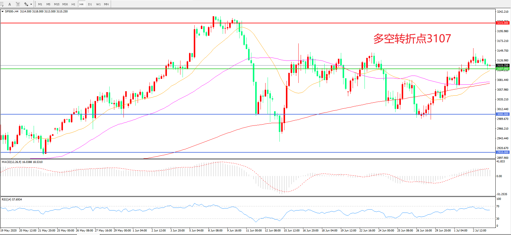 4小时图看,标普500震荡回升,短期走势偏强,均线系统走平, MACD绿柱减少,红柱增加,RSI指标走平,日内延续震荡概率较大。