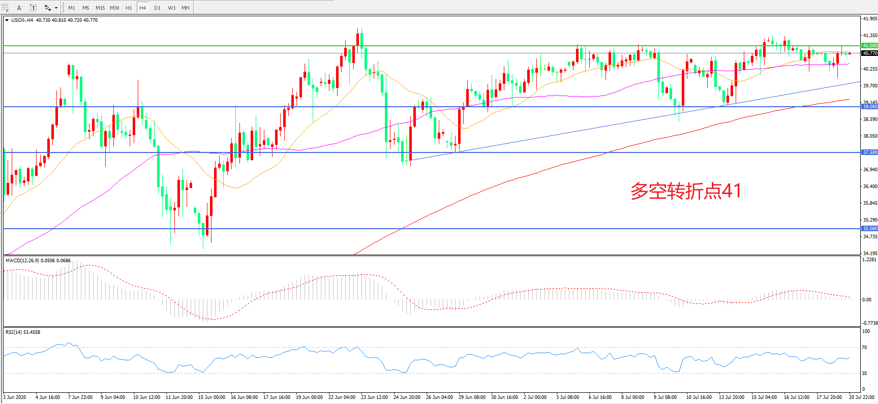 周一(7月20日),美国新冠确诊激增增和美国消费者信心下降,削弱了原油需求回升的前景 ,WTI油价一度快速下行,但在刺穿40美元之后再次上演了反转大戏,最终收报40.77美元/桶。短期来看,油市整体仍陷入区间震荡之内,市场观望气氛较浓。