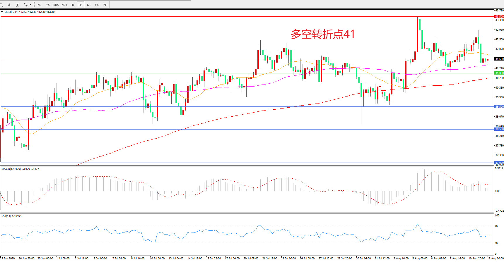 4小时图看,油价延续宽幅震荡,短期波动放大,55周期均线成为下方支撑,43.5美元成为上方阻力,MACD红柱较少,RSI指标走平,日内延续上行概率较大。