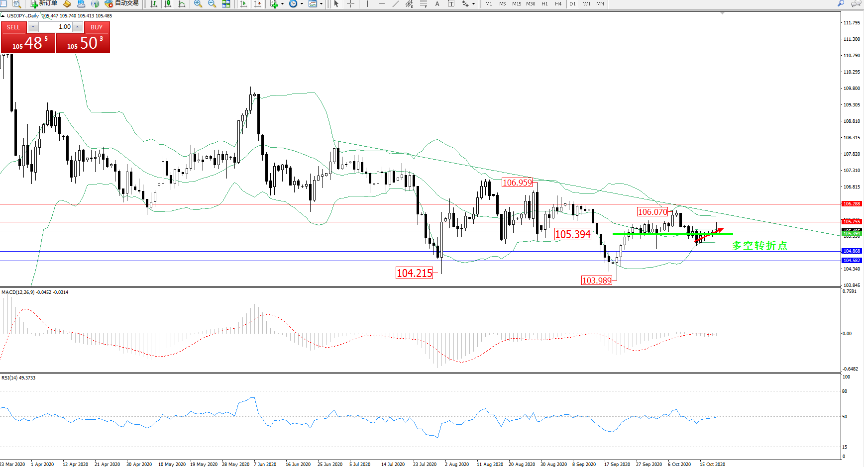 美元兑日圆处于105.475附近整理中,在市场风情情绪风向标指挥下,过去一个月来美元与日元同涨同跌的基本格调仍在维持,后市在美国大选结果揭晓前,这一趋势仍会继续延续下去;当前,美元兑日元正继续横盘于104.95-106.10这一箱体区间之中,受到欧洲疫情扩大和贸易风险再燃的影响,美元及日元兑欧系及商品系货币仍同步走强,竞争性升值走势将至少在下月美国大选投票日前得到维持,此后汇价的分化方向则取决于之后美元指数有否突破性行情出现。大量投资者都处在观望状态,等待大选之后再入场。基金经理们都等待着熬过这些风险事件,之后市场不确定性的下降对风险资产是利好的。