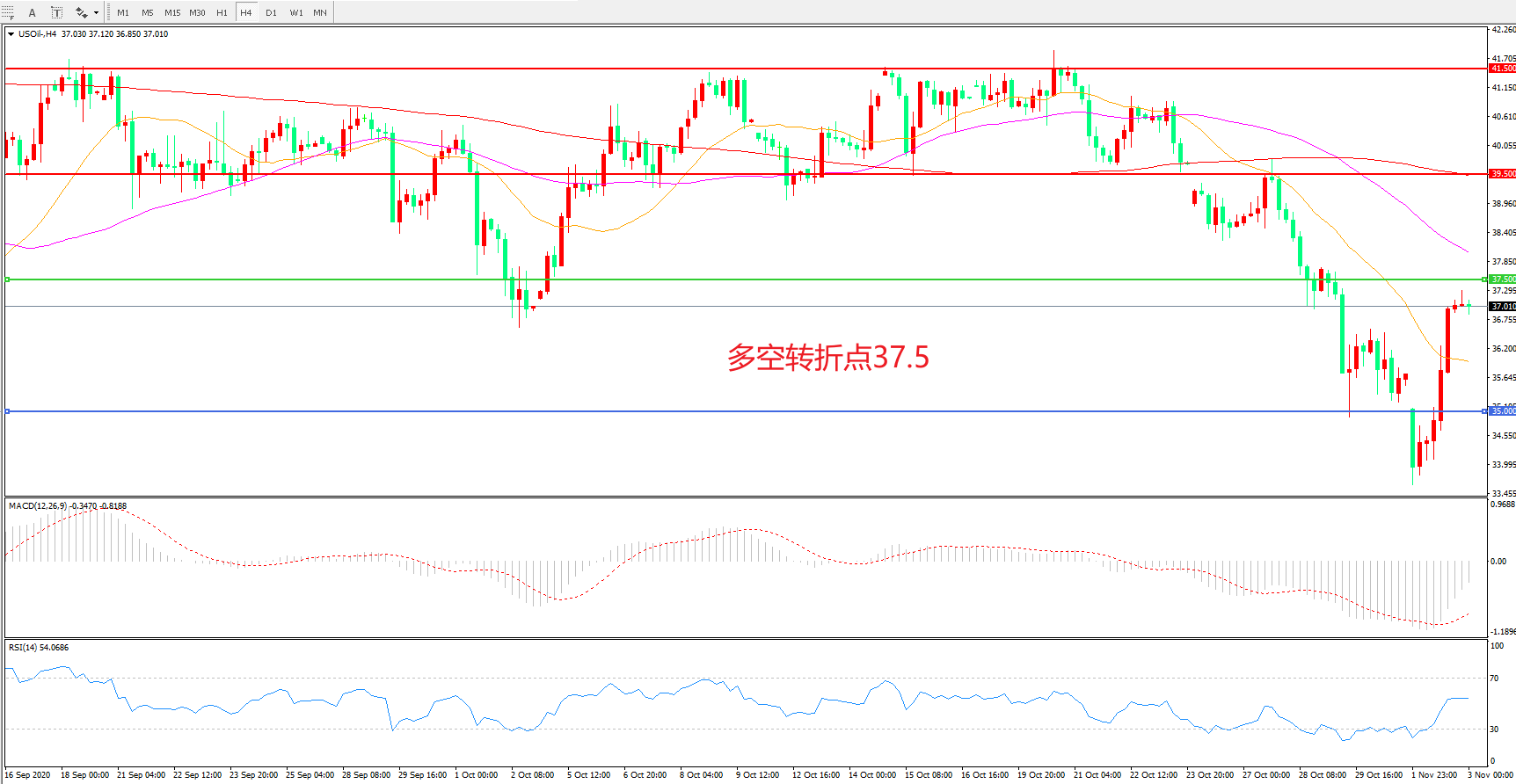 4小时图看,油价低位连续拉升,短期表现有所回暖,37.5美元成为上方阻力,均线系统走平,MACD绿柱缩短,RSI指标走平,日内延续震荡概率较大。