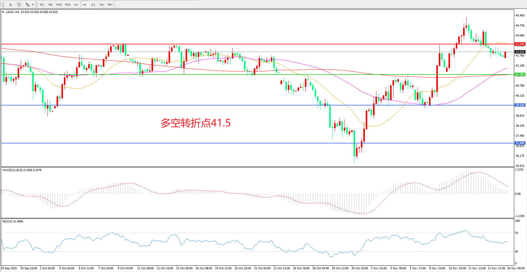 4小时图看,油价整体呈现冲高回落形态,短期走势陷入震荡,43.5成为上方阻力,41.5成为短期支撑,短期均线逐渐走平,MACD红柱减少,RSI指标走平,日内震荡上行概率较大。