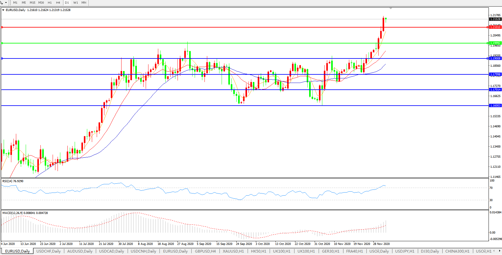 美元指数下跌0.35%至70.70,盘中一度低见90.50,为2018年4月以来最低;对美国有望达成财政刺激协议的乐观情绪一度导致其下跌0.6%,并且该指数在整个纽约交易时段保持跌势。美国众议院议长佩洛希和参议院共和党领袖麦康奈尔就新冠援助计划进行了磋商,这可能是取得进展的一个迹象。渣打的,投资者抛弃了之前做空避险货币的相对价值交易,转而直接做空美元。欧元兑美元盘中一度飙升至2018年4月以来最高的1.2175,尾盘涨0.24%至1.2144;实钱货币的卖盘令汇率上涨放慢;交易员指出在1.2150附近存在关键阻力,其中包括2018年3月1日低点1.2155;一周期隐含波动率连续第九天上涨,并达到了11月4日以来的最高水平8.39%。欧洲央行表示,将在12月10日开会时提供进一步刺激措施以帮助欧元区。市场人士将关注有关欧元走强的任何评论。