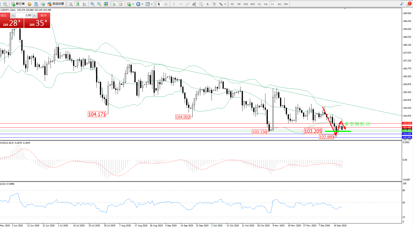 技术点评:空头动力延续布林带指标通道持续震荡向下移动态势良好,低位抵达102.880附近节点后得到支撑开始反转上扬,回升至布林带指标中轨附近节点后遇阻开始缓慢回撤下行,短时间维持底部震荡中,布林带指标呈张口走势持续中,MACD指标处于0轴线下方空头区域维持整理下行后开始平移,RSI指标处于50均衡线下方空头区域维持整理;