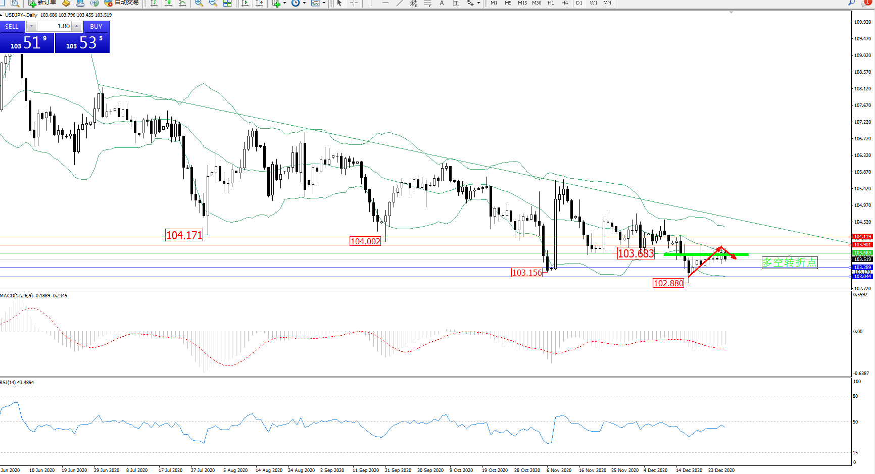 技术点评:空头动力延续布林带指标通道内中下轨区间弱势震荡向下移动态势良好,底部抵达102.880位置后开始反转向上移动,抵达布林带指标中轨位置后开始反转向下移动,布林带指标呈收口走势后有继续张口迹象,MACD指标处于空头区域底部维持整理平移中,RSI指标处于50均衡线下方空头区域窄幅整理平移中;