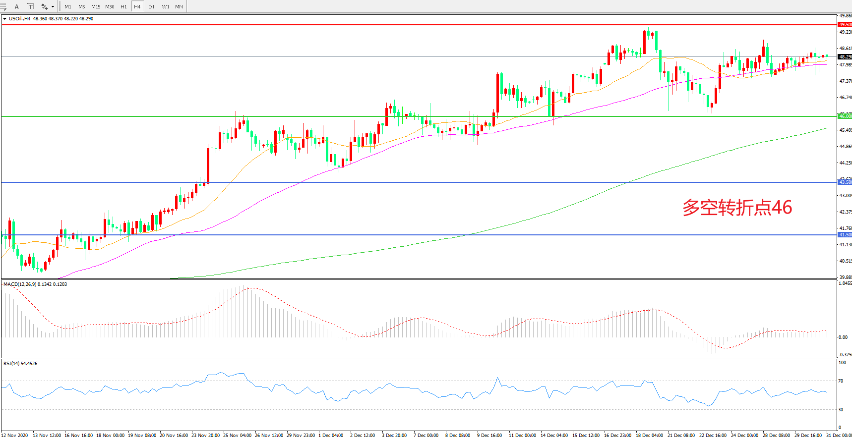 周三(12月30日),根据美国能源信息署公布的数据显示,当周EIA原油库存降幅超预期,利好油价,但由于双旦假期,价格整体波动幅度有限,美国WTI原油延续高位震荡,收报48.24美元/桶,越来越多的迹象说明,多头对市场的把控力已经慢慢消退。