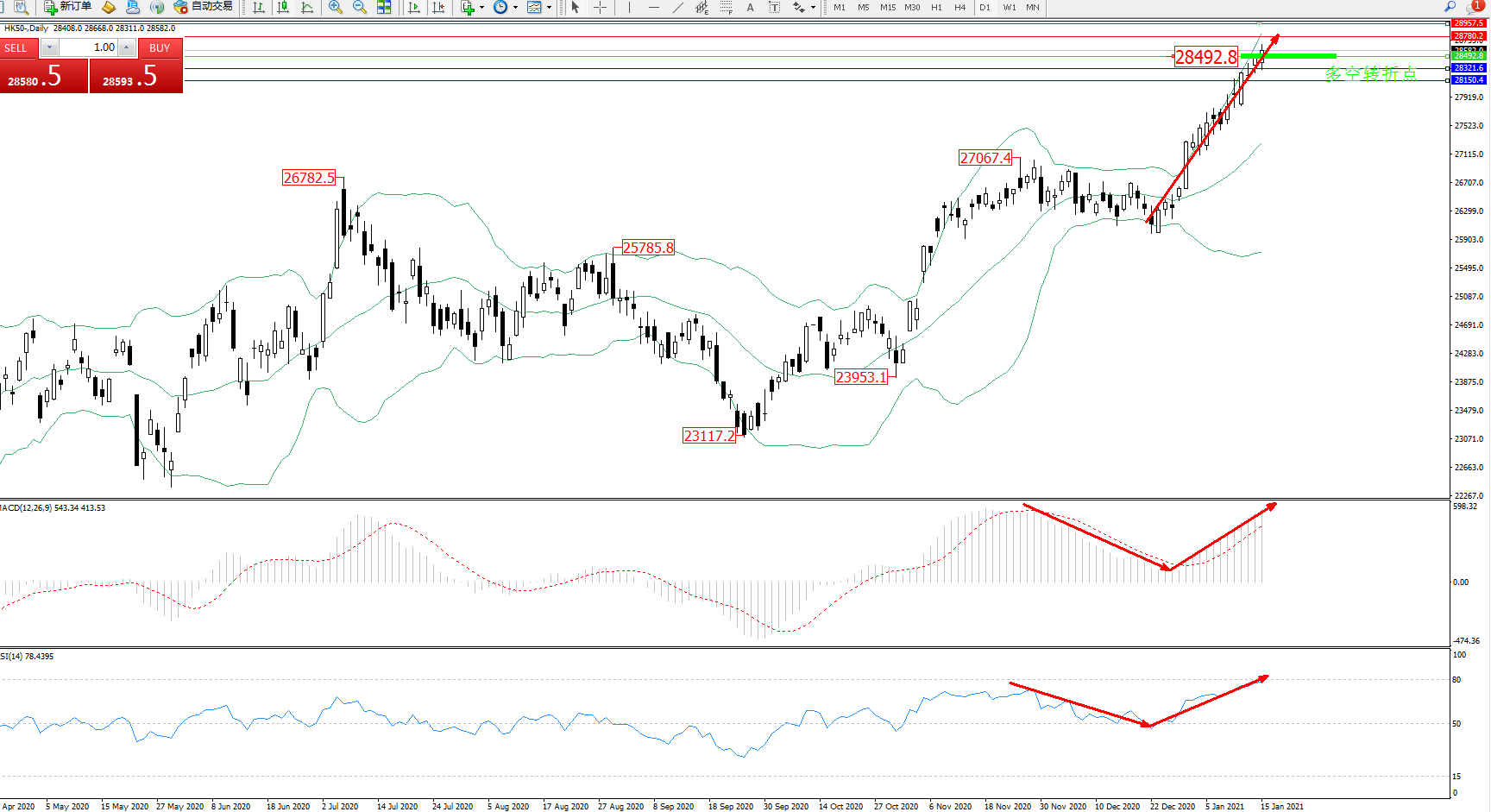 技术点评:多头动力延续布林带指标上轨附近持续震荡上扬态势良好,布林带指标呈张口走势中,多头潜力屡破新高,尚未有止步迹象,关注布林带指标上轨附近关键节点,MACD指标处于0轴线上方多头区域高位持续震荡向上移动中,RSI指标处于多头区域持续震荡上扬后即将触及80均衡线附近节点;