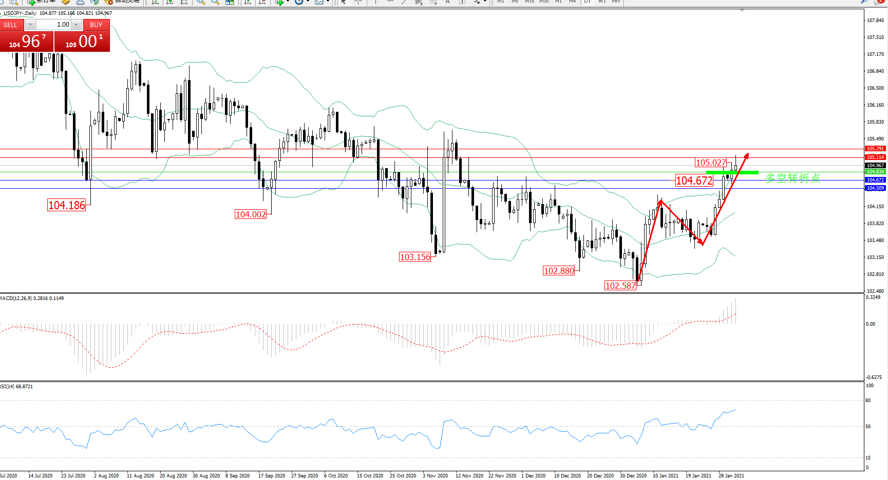 日元兑美元连续第五天下跌,是9月25日以来最长连跌;美元兑日元涨0.05%至104.98,盘中触及11月12日以来最高;做空美元、做多日元的交易员需要平仓买入美元和卖出日元。美元兑日元延续了本周强劲的上涨势头,日本首相菅义伟将紧急状态延长至3月7日,同时注意力转向了美国的一揽子刺激计划,这些因素给美元兑日元带来支撑。日本经济再生兼社会保障改革担当大臣西村康稔表示,政府正在考虑将10个都府县的紧急状态延长至3月7日。西村在就抗击疫情举行的会议上指出,虽然目前的疫情形势正在改善,但医疗系统仍面临压力。日本政府将于2日晚上决定对此前发布紧急状态宣言的10个都府县予以延长,包括首都圈4都县、东海2县、近畿3府县和福冈县。日元贬值在短期内可能会进一步扩大。美国的财政刺激谈判利好市场风险偏好情绪,这给美元兑日元带来支持。