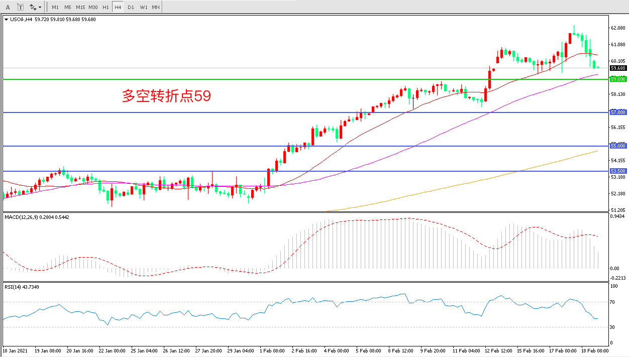 周四(2月18日),根据美国能源信息署公布的数据显示,当周EIA原油库存意外大幅度减少7,好于市场预期,但美国持续的寒潮可能使炼油厂未来一周继续关闭,市场风险情绪回落,美国WTI原油震荡下行,收报59.63美元/桶。目前全球石油基本面大部分时间处于紧平衡状态,一旦市场供需失衡超过300-500万桶/日的水平,油价就可能出现暴涨暴跌。