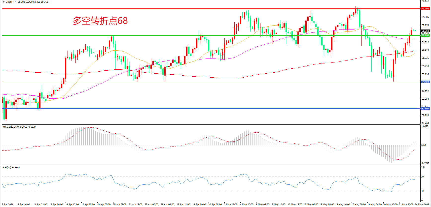 4小时图看,油价连续长阳拉升,短期走势有所回暖,55周期均线成为下方支撑,70美元成为中期阻力,MACD红柱增加,RSI指标向上,日内震荡上行概率较大。