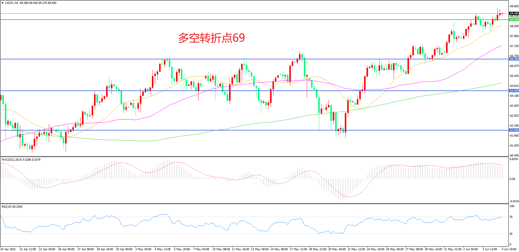 4小时图看,油价延续上行走势,强势突破整理区间,整体表现偏强,69美元成为短期多空分水岭,均线系统呈多头排列,MACD红柱增加,RSI指标走平,日内震荡上行概率较大。