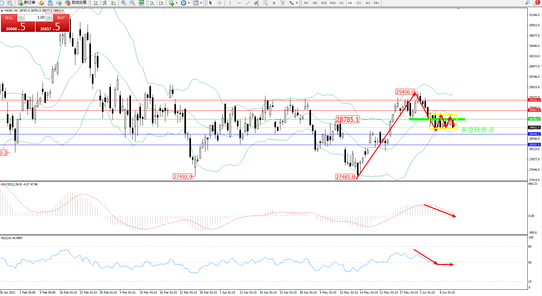 交易策略:28785下方看跌,目标28446、28202