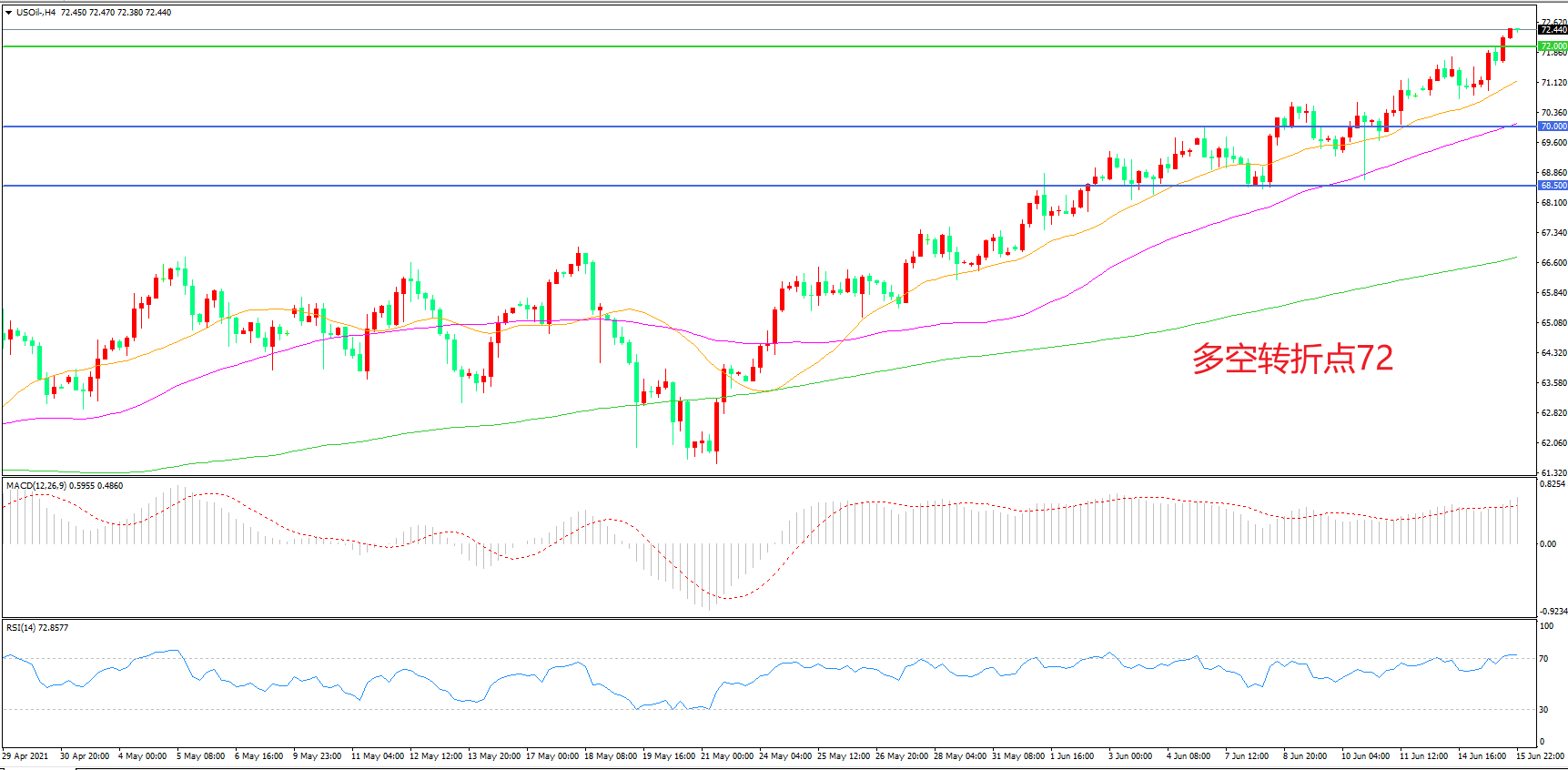 周一(6月15日),随着各个国家经济活动回归正轨,市场对燃油需求快速恢复,使得油价得到有力支撑,美国WTI原油延续“高歌猛进”的状态,大幅走高后收报72.43美元/桶。周二(6月16日),根据美国石油协会数据显示,当周API库存骤降850万桶,利好油价,若晚间EIA的数据表现与此一致,油价有望再创新高。