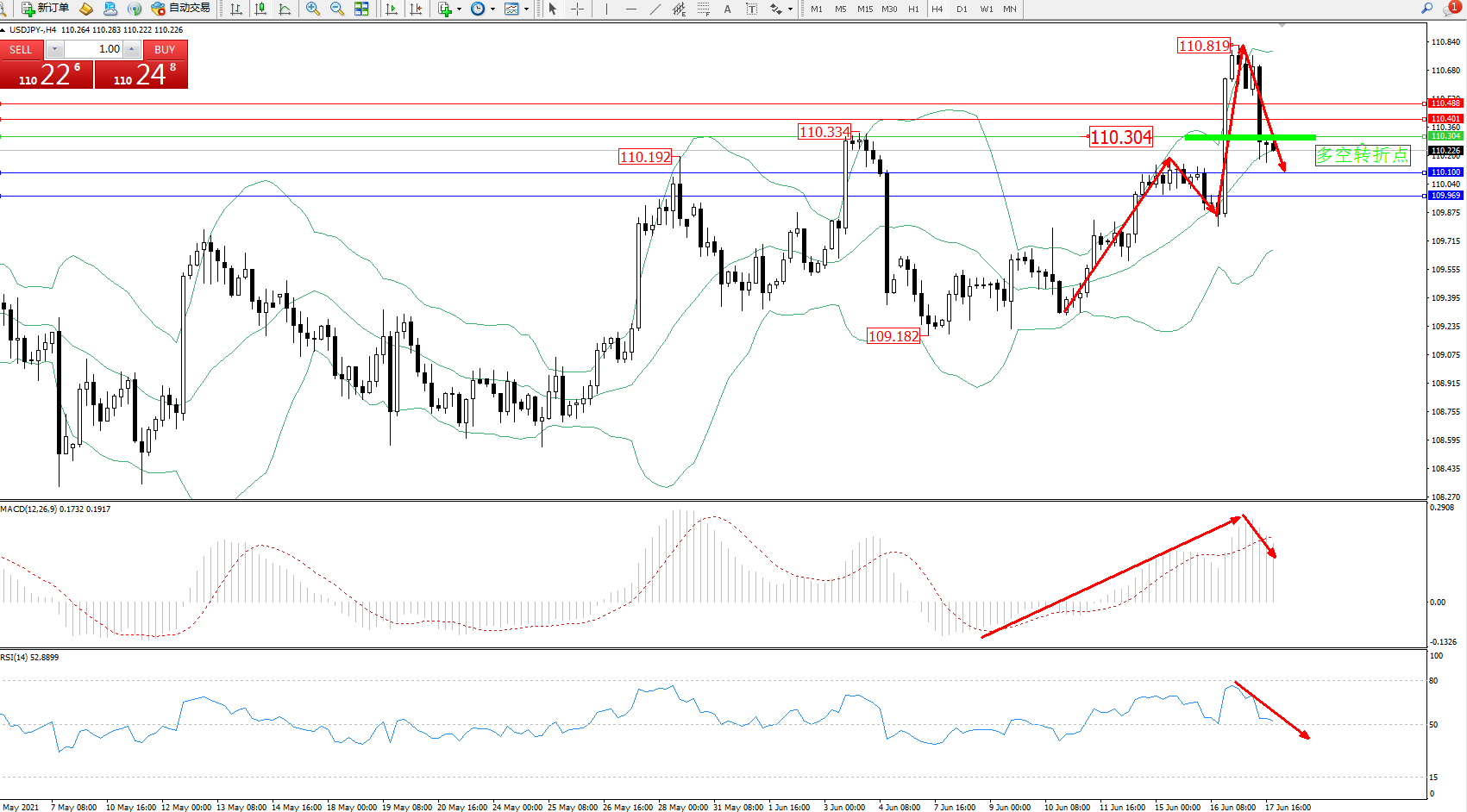 交易策略:110.304下方看跌,目标110.100、109.969