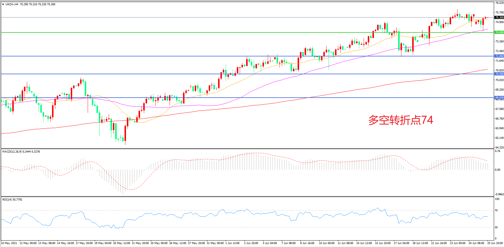 4小时图看,油价突破74美元阻力后再度上行,短期表现强势,均线系统成为下方支撑,MACD红柱增加,RSI指标走平,日内震荡上行概率较大