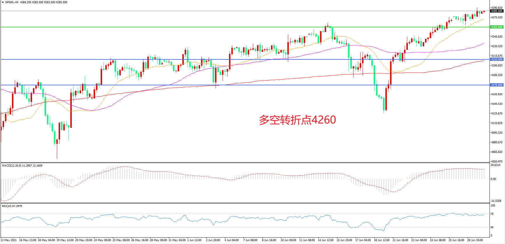 周二(6月29日),强劲经济数据及大型银行宣布上调股息为市场带来提振,但德尔塔变异毒株扩散为市场带来压力,多空博弈陷入胶着,标普500延续高位震荡,收报4284.00点。从当前情况看,美联储政策仍为美股的最大变数,如果美联储能够较慢地收紧货币政策,则美股受到的负面影响将较小,但如果美联储快速且无预警地收紧政策,美股等风险资产将出现大幅波动。