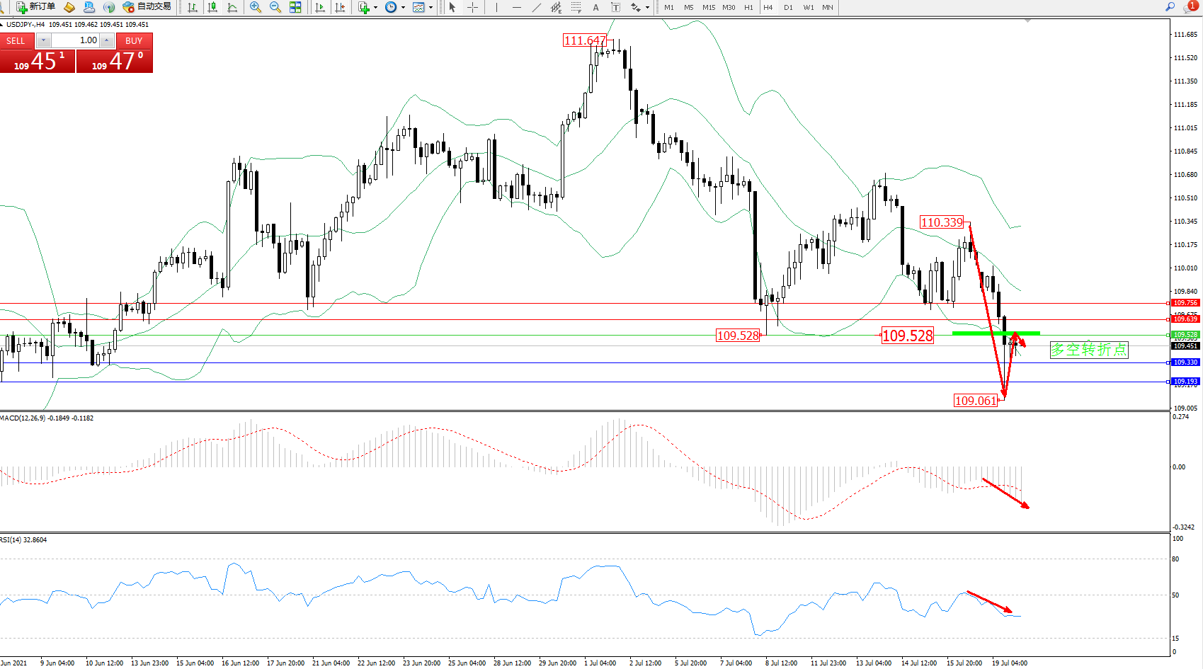 技术点评:空头动力延续布林带指标通道中下轨区间持续震荡下行,跌破下轨后抵达低位109.061位置后强势反转回升,纠结于下轨附近不断整理向下移动中,布林带指标呈下行趋势走势良好,且有张口迹象,MACD指标处于空头区域持续震荡向下移动中,RSI指标处于50均衡线下方空头区域维持整理下移后开始平移;