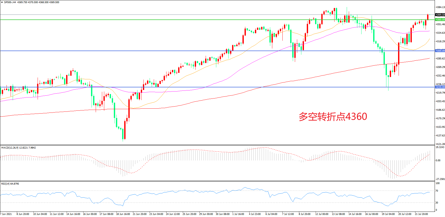 4小时图看,标普500回踩200周期均线后大幅反弹,整体表现偏强,4360成为短线多空分水岭,均线系统走平, MACD红柱增加,日内震荡上行概率较大。