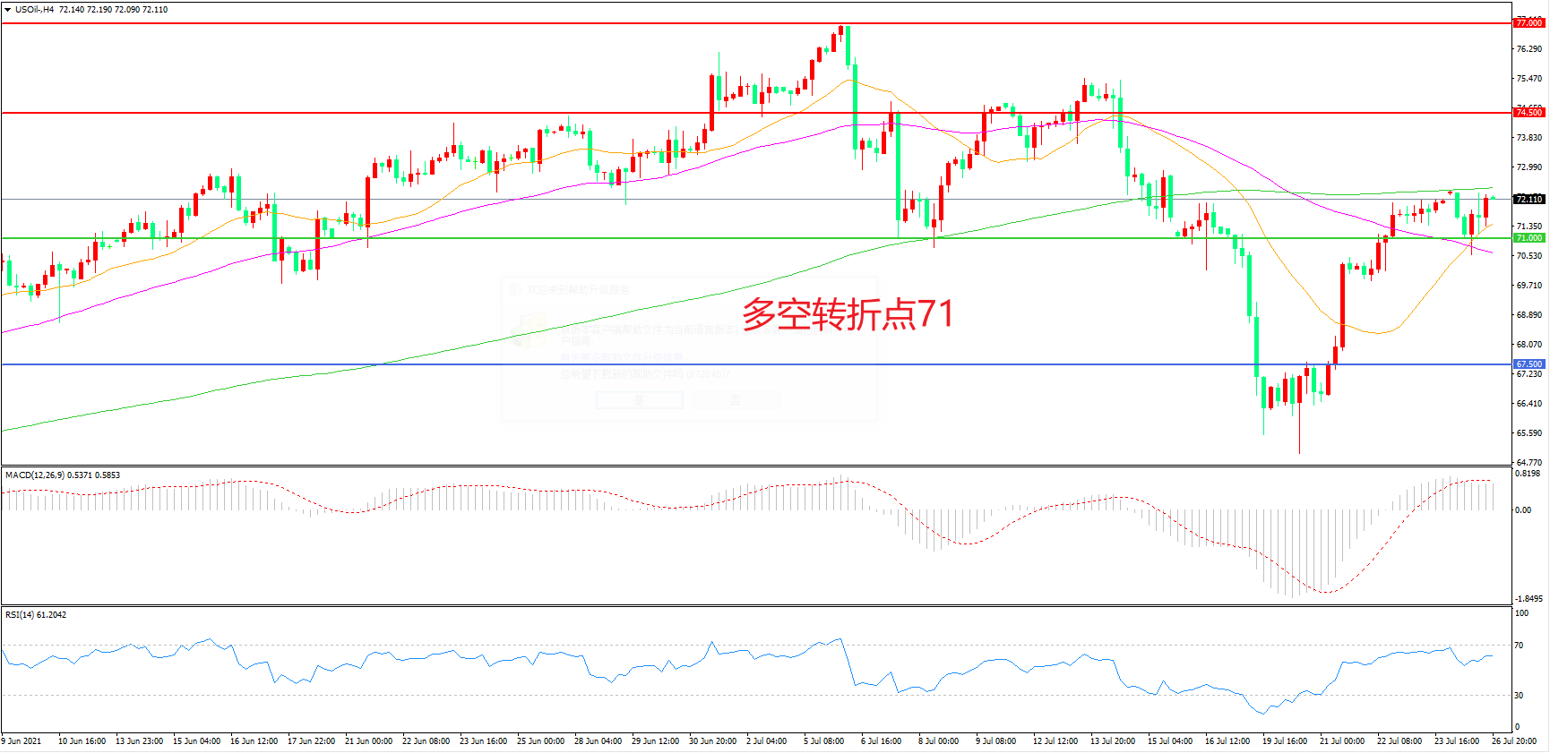 4小时图看,油价长阳拉升后延续高位震荡,200周期均线成为短期阻力,71美元成为多空分水岭,均线系统走平,MACD红柱增加,日内震荡上行概率较大。