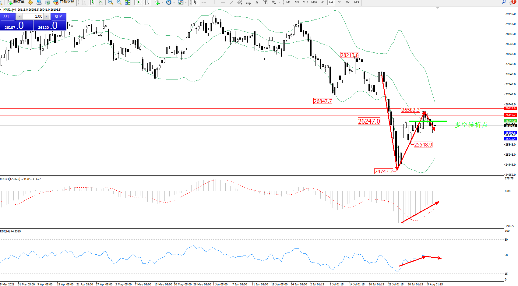 技术点评:空头动力延续布林带指标下轨附近持续下探,低位抵达24743位置呈V型反转上移,触及中轨附近后开始震荡短暂遇阻回撤,布林带指标呈收口走势持续中,MACD指标处于空头区域低位震荡缓慢上移,RSI指标处于50均衡线下方空头区域维持震荡中;
