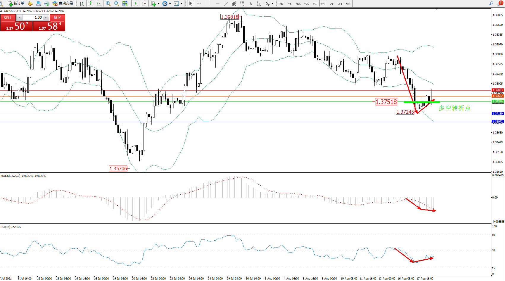 交易策略:1.37518下方看跌,目标1.37189、1.36972