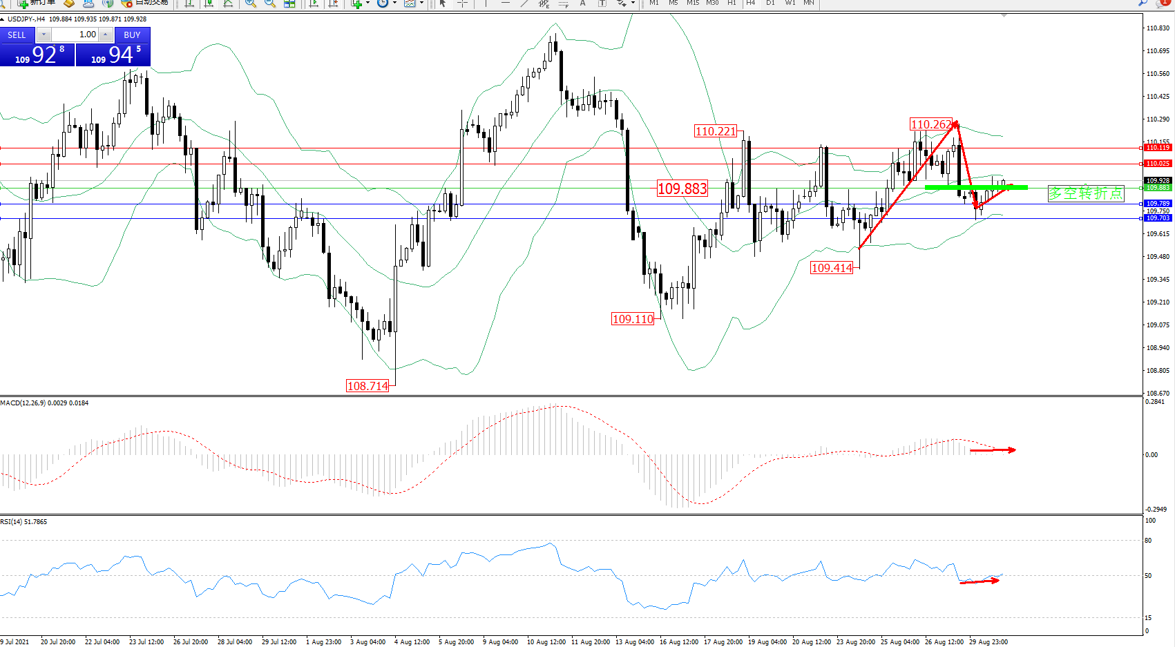 技术点评:多头动力延续布林带指标通道内持续宽幅震荡向上移动,高位抵达110.262位置遇阻回撤,触及下轨附近节点后再度缓慢上移,纠结于中轨下方弱势徘徊,布林带指标呈收口走势持续平移中,MACD指标处于0轴线附近弱势徘徊中,RSI指标处于50均衡线附近窄幅整理中;