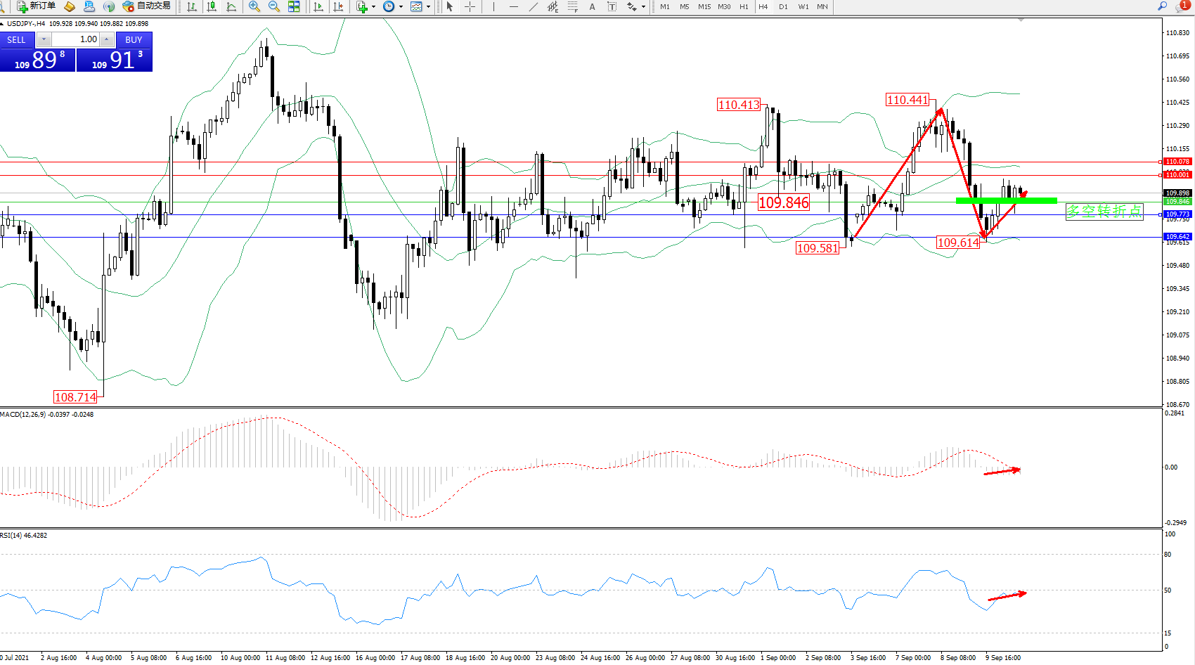 技术点评:长时间维持在布林带指标通道内宽幅震荡中,期间多次来回试探上下轨区间节点,低位109.614附近得到支撑后缓慢震荡上移,布林带指标呈收口平移走势中,MACD指标处于0轴线下侧弱势徘徊,RSI指标处于50均衡线下方窄幅整理;