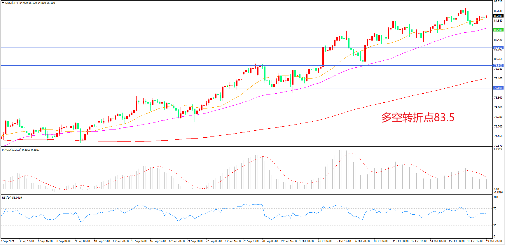 4小时图看,油价以55均线为依托,整体呈现上行形态,MACD红柱增加,RSI指标走平,日内延续上行概率较大。