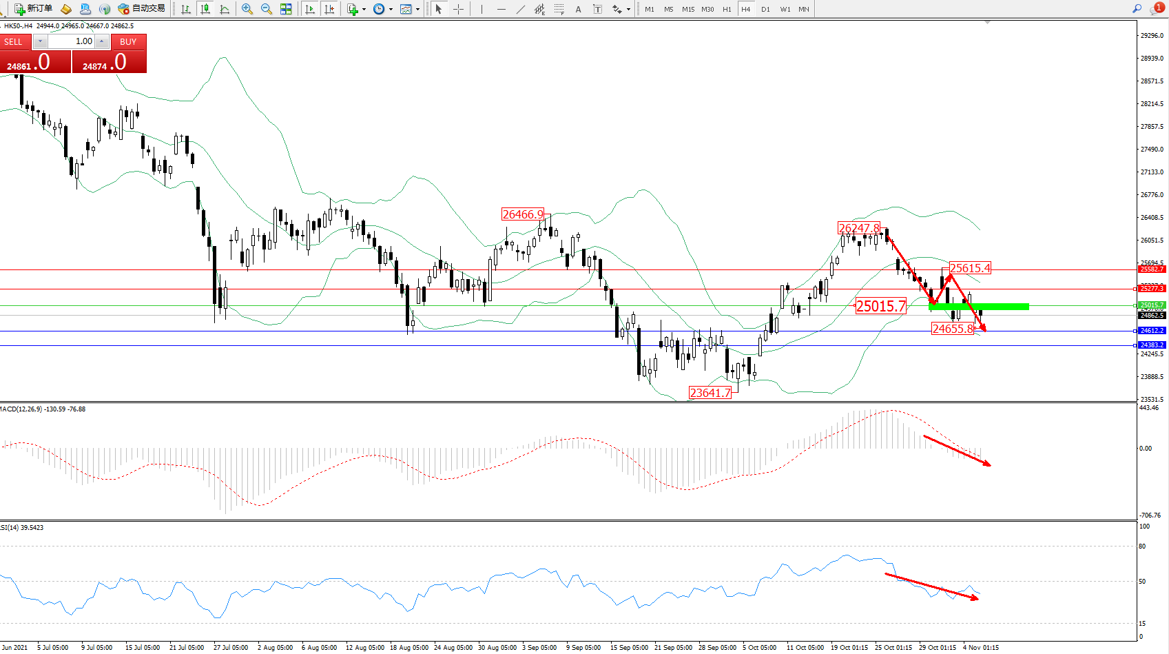 恒指HK50 ——4小时K线图显示: