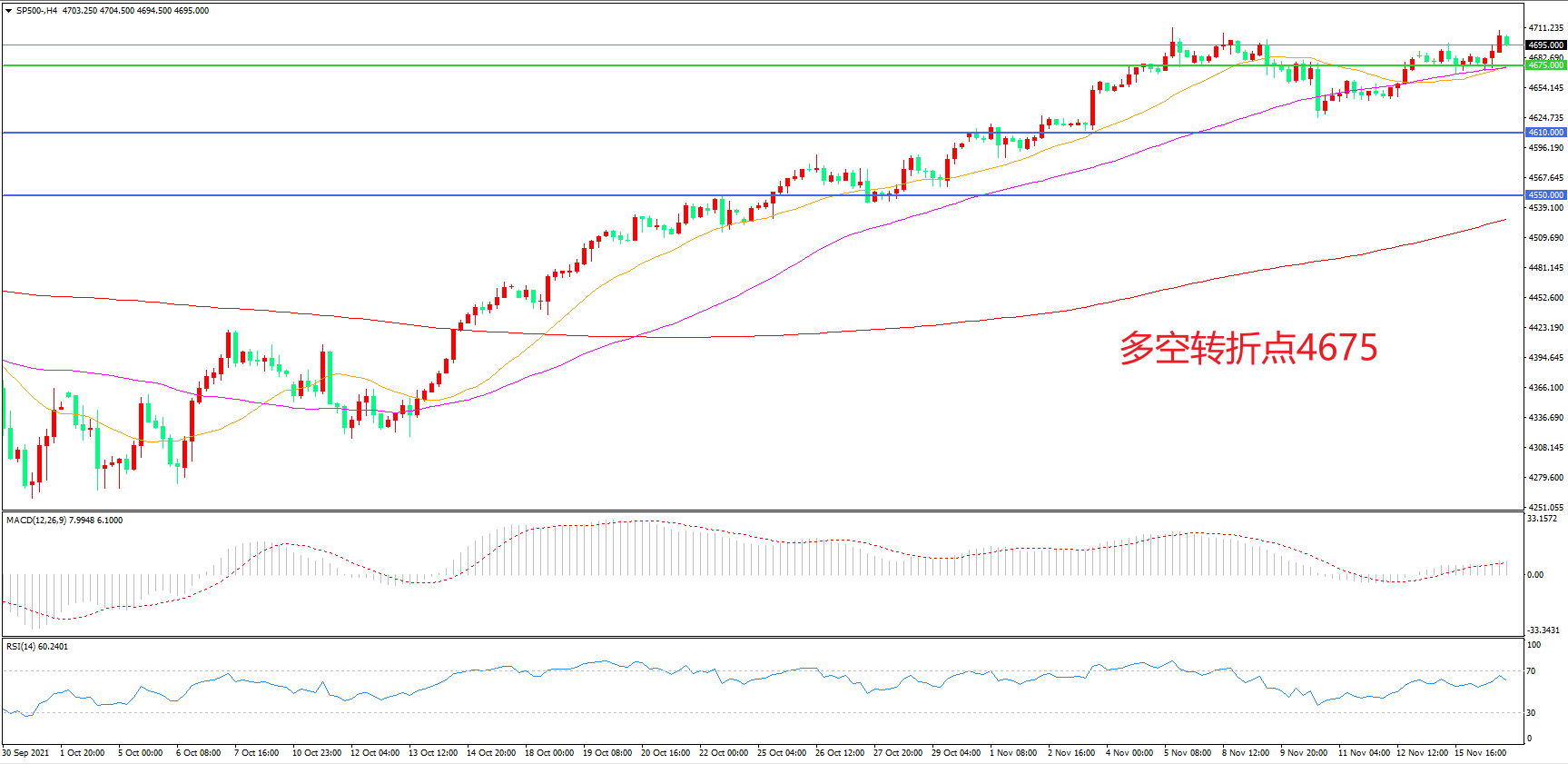 周二(11月16日),圣路易斯联储主席布拉德发表鹰派讲话,认为美联储应为对抗通胀加快速度Taper,但美股并未像此前那样受联储撤QE预期拖累,标普500大幅走高,收报4695点。目前中美元首视频会晤后,多头信心有所提振,如果后续中美关系有更多改善继续,可能会推动风险情绪有所回暖。