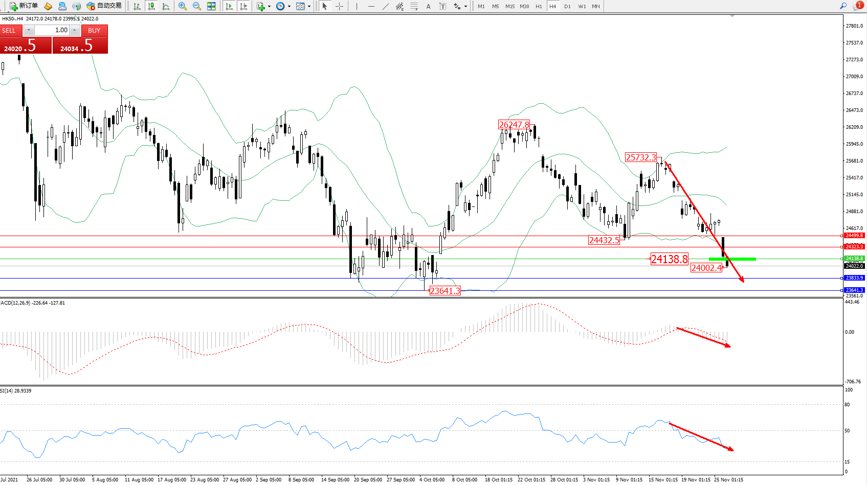 香港恒生指数11月26日(周五)收盘下跌659.64点,跌幅2.67%,报24080.52点;港股三大指数集体大跌,行业板块近乎全挫,权重科技股领衔大市下跌。恒生科技指数跌3.25%报6151点。大型科技股快手跌8%,阿里巴巴跌4.6%,美团、百度、腾讯跌超3%;生物科技股逆势走强,家电等个别板块上涨。今日大市成交额为1297亿港元,南下资金逆势净流入22.23亿港元。内地与香港疫情防控工作第二次对接会11月25日在深圳举行,内地专家认为,香港防控工作成效明显,又向香港特区政府提出了进一步完善的意见建议。今日,香港特区行政长官林郑月娥表示,这一次会议是“通关”的重要里程碑,内地专家已确认香港具备“通关”条件,她预计下周可以公布港版健康码详情。