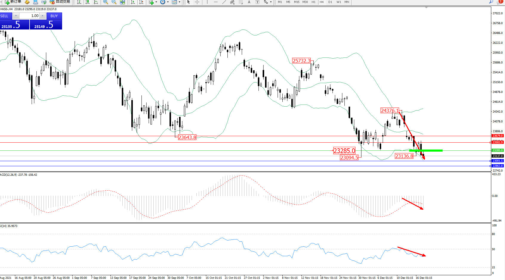 恒指HK50 ——4小时K线图显示: