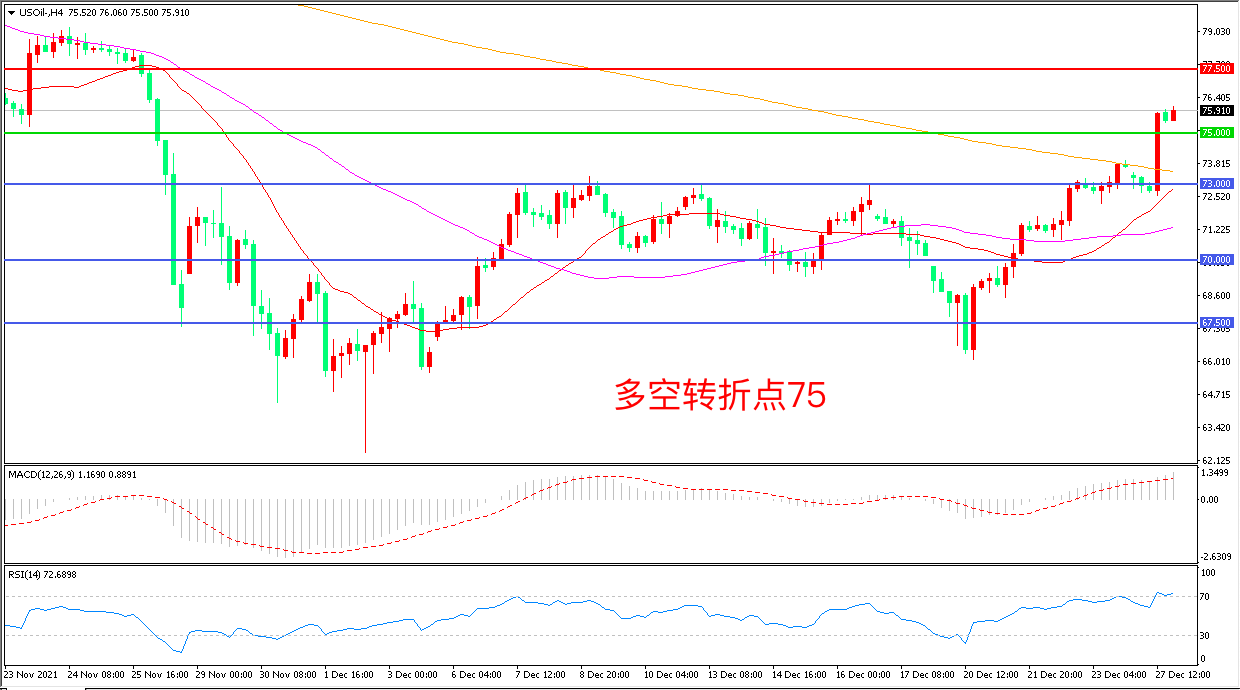 周一(12月27日),投资者认为奥密克戎可能不像其他变异毒株那样严重,因而对全球油需前景影响有限,乐观预期推动风险情绪回升,美国WTI原油涨逾4%,收报75.91美元/同,创11月26日以来新高。目前全球复苏故事仍处正轨,如果疫情防控效果得当,油价有望续创新高。