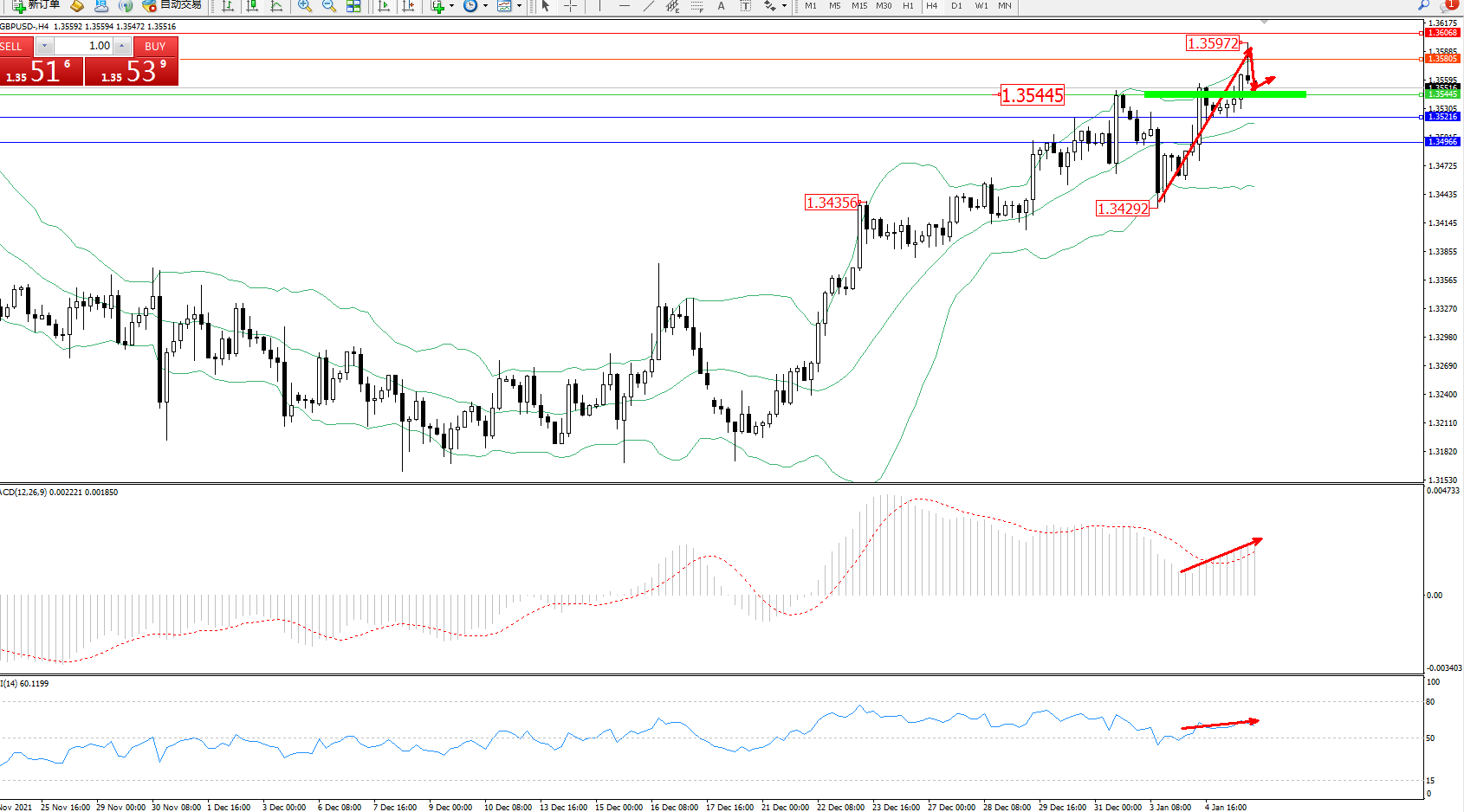 交易策略:1.35445上方看涨,目标1.35805、1.36068