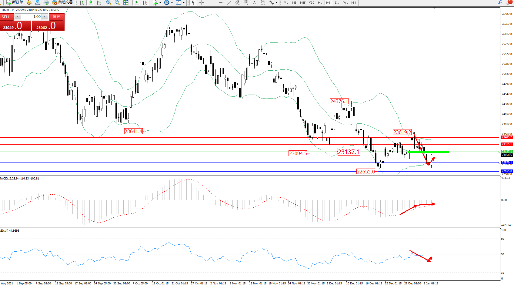 恒指HK50 ——4小时K线图显示: