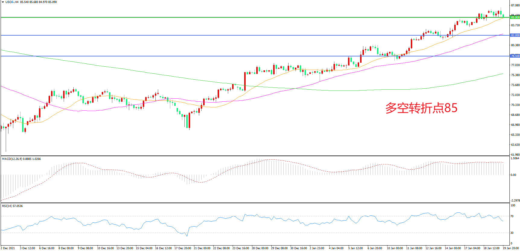 4小时图看,油价低点逐渐抬高,整体表现偏强,均线系统呈多头排列,85美元成为多空分水岭,MACD红柱增加,RSI指标走平,日内震荡上行概率较大。