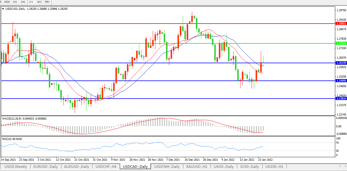 美元兑加元跌0.07%至1.2629,因黄金和WTI原油上涨,加拿大央行周三将发布政策决定。