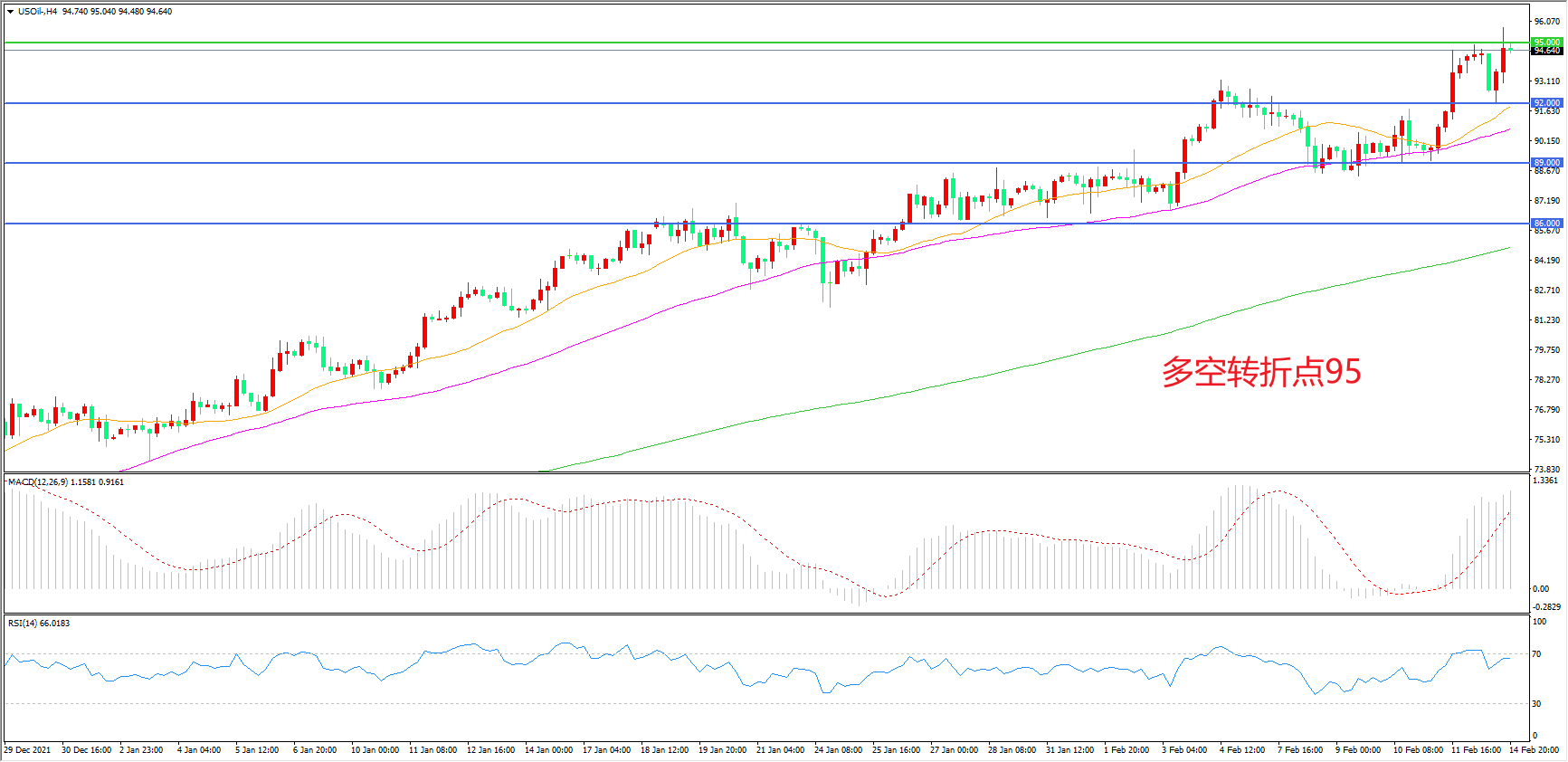 周一(2月14日),俄乌局势持续紧张,战争阴霾笼罩导致油价走势偏强,美国WTI原油延续强势表现,收报94.76美元/桶。俄乌爆发武装冲突可能引发欧美制裁俄罗斯,破坏俄罗斯作为原油超级大国超级大国的出口,在库存很低且闲置产能进一步减少的当下会扰乱供应端,短期内油价延续强势概率较大。