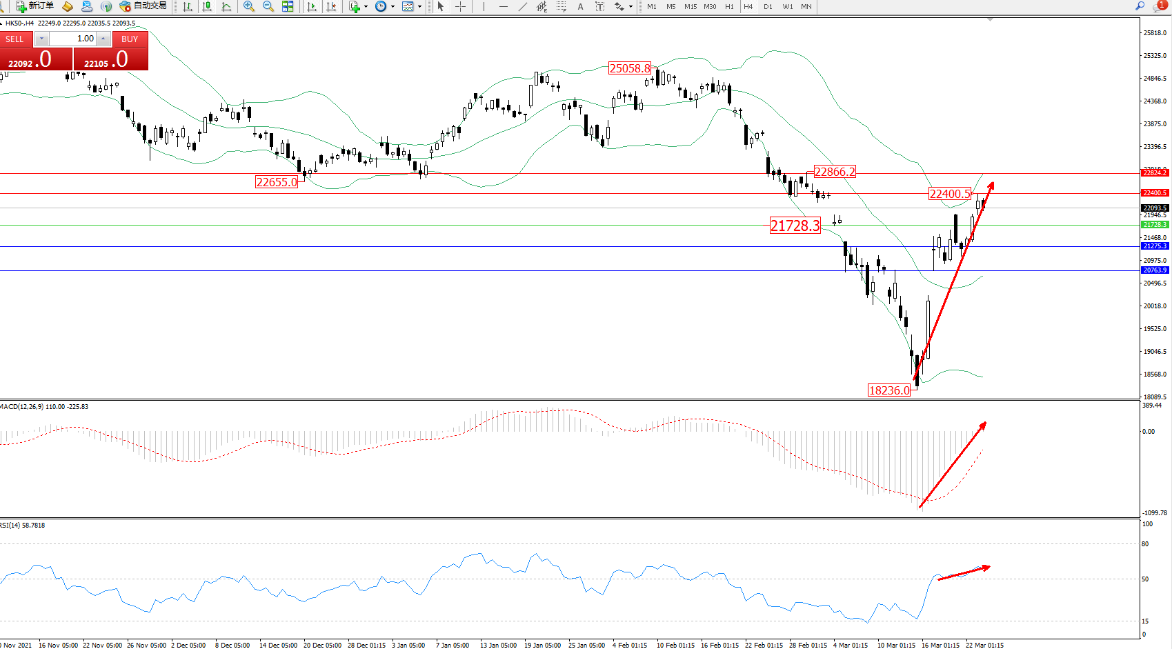 香港恒生指数3月23日(周三)收盘上涨264.8点,涨幅1.21%,报22154.08点;港股延续反弹行情,6个交易日累计涨逾20%,重回22000点上方,恒生科技指数涨2.05%,盘中一度涨近5%。今日南下资金净流入54.98亿港元,大市成交额为1773亿港元。大型科技股普遍造好,阿里巴巴、快手涨超6%,小米涨4%,百度、网易、美团皆有涨幅,京东尾盘转跌;美联储疫情爆发以来首次宣布加息,料成为2023至2024年香港本地银行主要盈利驱动力,加息将于2024年推动净息差扩张约45个基点及股本回报率改善约4个百分点。该行指,在香港相对宽松的流动性以及目前较弱的宏观环境,相较今年,银行到2023至2024年将更能从利率上升中受惠。