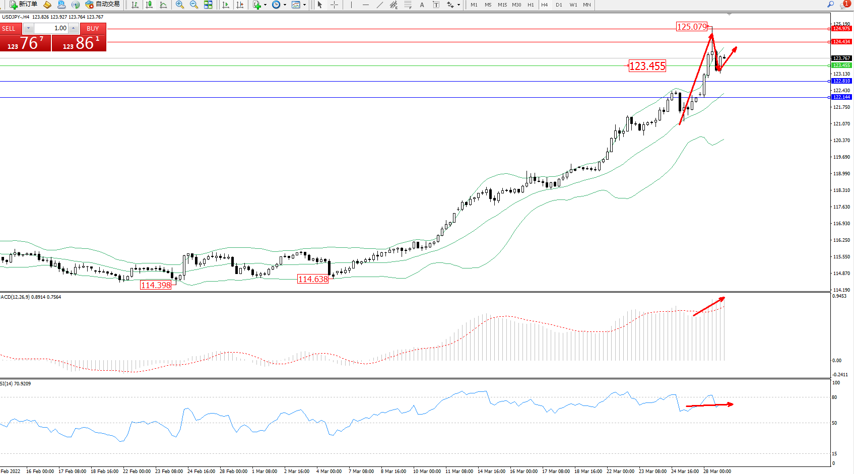 技术点评:多头动力延续布林带指标通道中上轨区间持续震荡上扬,高位突破上轨至125.079位置节点后遇阻回撤,短期纠结于上轨内侧震荡,多头不断攀升态势良好,布林带指标呈上行趋势走势持续中,MACD指标处于多头区域维持震荡上扬,RSI指标处于多头区域维持震荡上移,多次触及超买区80均衡线位置节点遇阻下行整理;