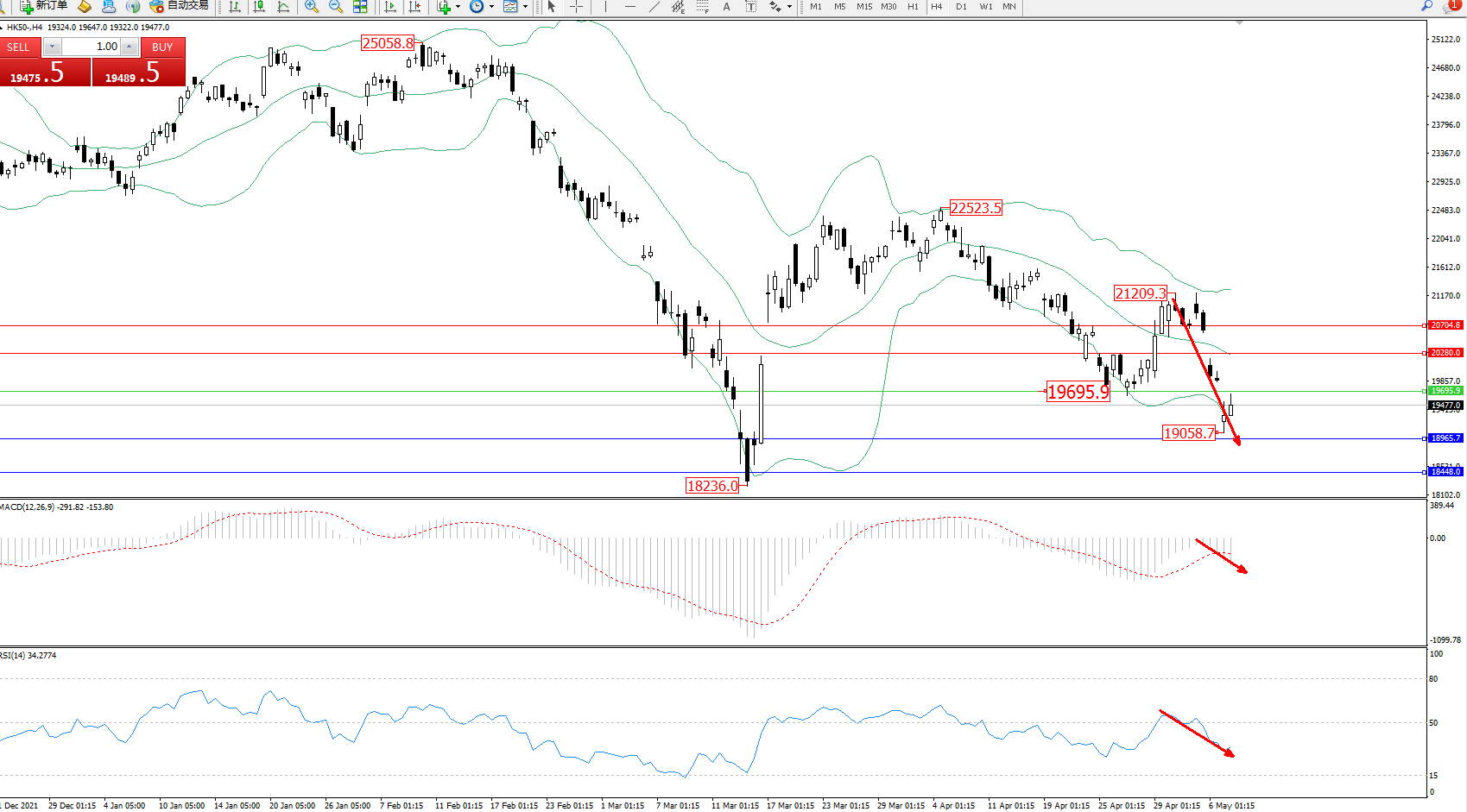 技术点评:空头动力延续布林带指标通道内维持宽幅震荡下行,低位抵达19058附近节点后震荡,短期空头动力低位开始缓慢回升,但市场空头下行趋势态势良好,布林带指标呈空头不断下行中,MACD指标处于0轴线下方弱势震荡下挫,RSI指标处于50均衡线下侧不断向下移动中;