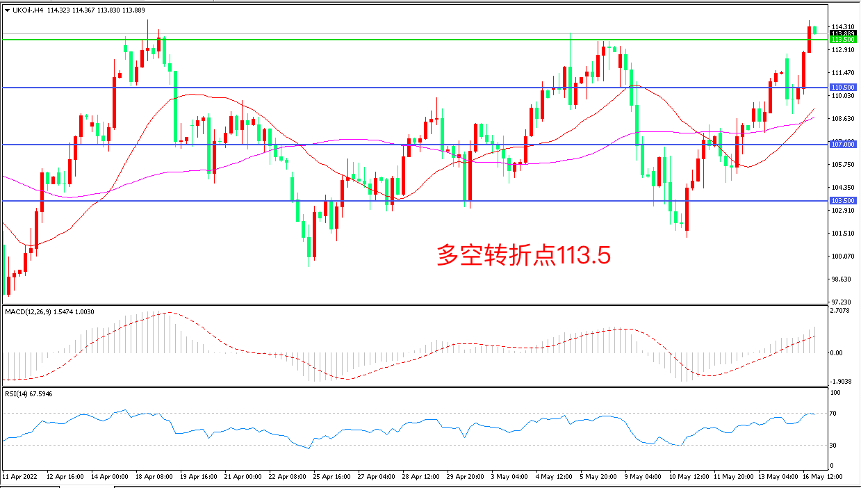 4小时图看,油价长阳连续拉升,短期走势偏强,均线系统拐头向上,MACD红柱增加,RSI指标走平,日内震荡上行概率较大。