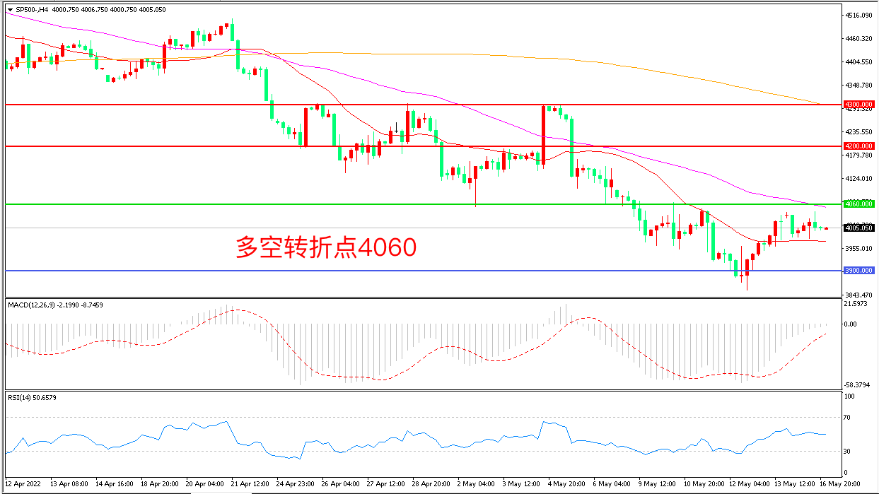 周一(5月16日),美股抛售潮在科技股的引领下延续。三大指数集体低开低走,标普500小幅回落,收报4004.55点。尽管大盘需要从周五收盘位下跌约200点才能进入熊市,市场表现得就像熊市已经到来。在通胀压力和借贷成本上升的情况下,经济下滑的风险仍是市场主要担忧,短期内美股延续下行概率较大。